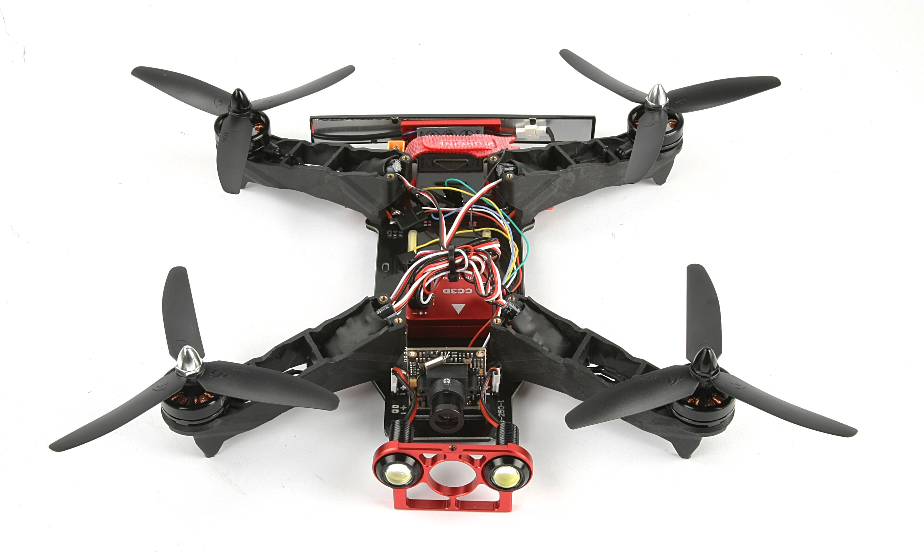 Der RaceCopter FPV 250 von ETurbine ist bereits zusammengebaut und wird mit einer Transporttascheausgeliefert. Das Modell ist mit 4 Stück TB2204 Brushless Motoren, 4 Stück 12 Ampere Brushlessregler, einem CC3D Flugkontroller und einer Kamera (CCD 700) ausgestattet. Zwei Power LEDs Vorne und ein LED Balken Hinten.