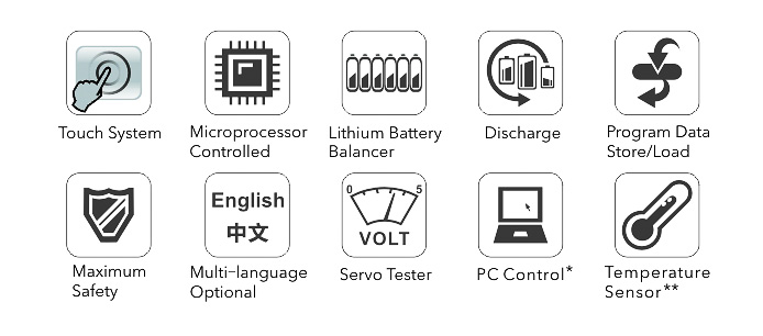 | Externe Anschlüsse | Balance XH-Type, Temperaturfühler, DC Eingang, USB für PC, AC Eingang, Power Port | |